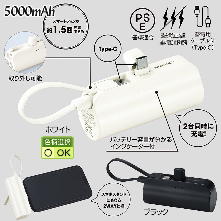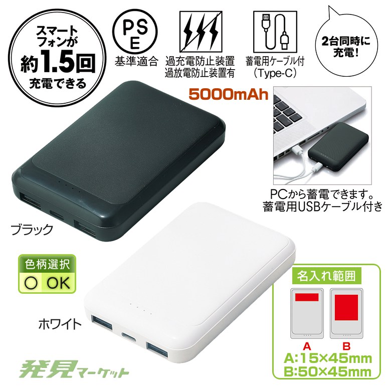 直挿タイプ 5000mAh モバイルバッテリー(色選択)
