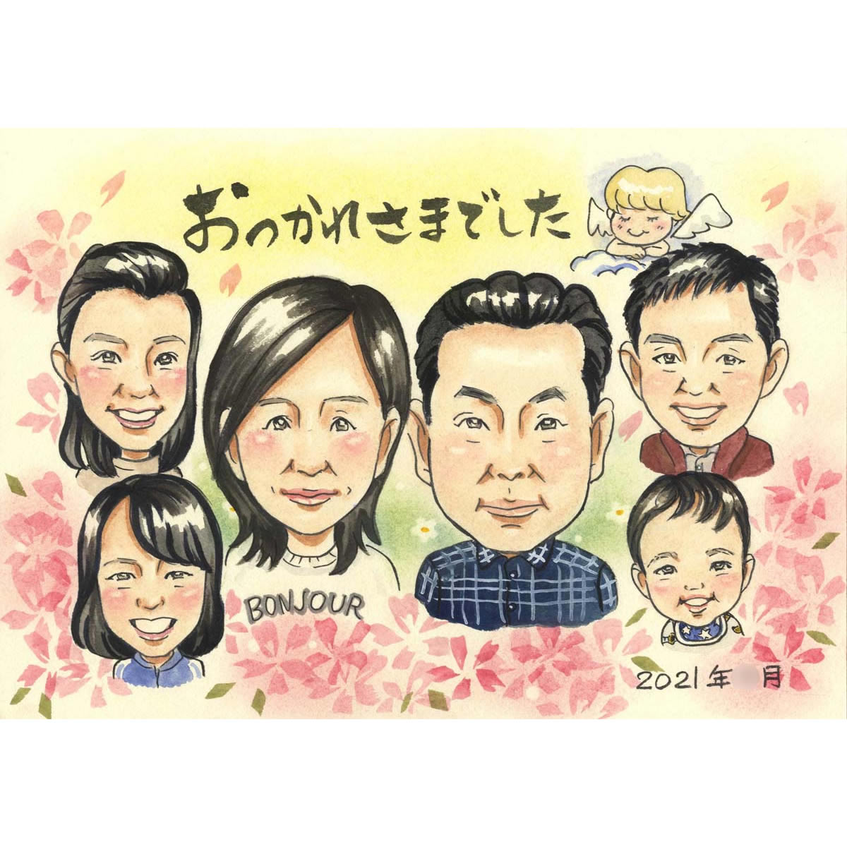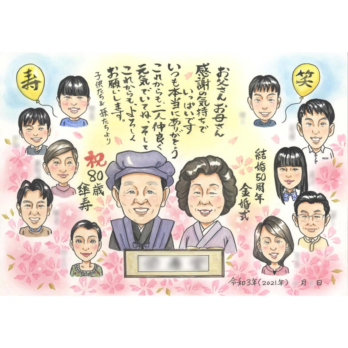80歳のおばあちゃん、おじいちゃんへの感謝を伝える傘寿似顔絵ギフト 80歳傘寿祝いの思い出に!家族と一緒の似顔絵ギフト