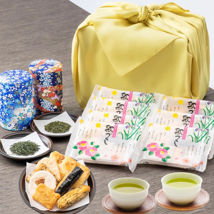 冨山米で作られた7種のあられ・お煎餅セット お煎餅と合う 備長炭火入れ静岡茶 風呂敷・青和染め茶缶 ギフト