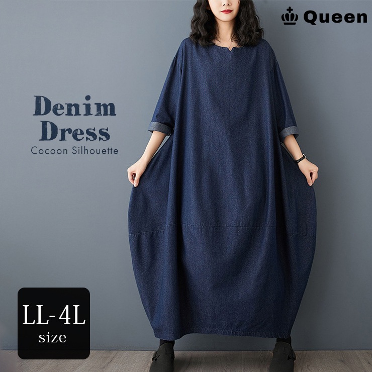 デニムワンピース 大きいサイズ 長袖 春ワンピ ロング レディース コクーンワンピ LL 3L 4L 春 秋 (562591)