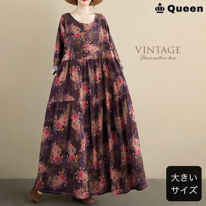 ヴィンテージ花柄ティアードマキシワンピース (15012)