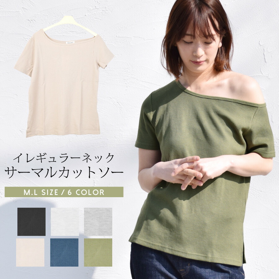 カットソー サーマル ワッフル レディース トップス 無地 半袖 イレギュラーネック 変形ネック 【送料pt100】