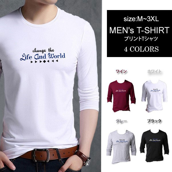 【即納】 メンズ ロングスリーブ タイト Tシャツ カットソー 長袖 英字 デザイン スリム 細身 お洒落 春 秋 送料無料