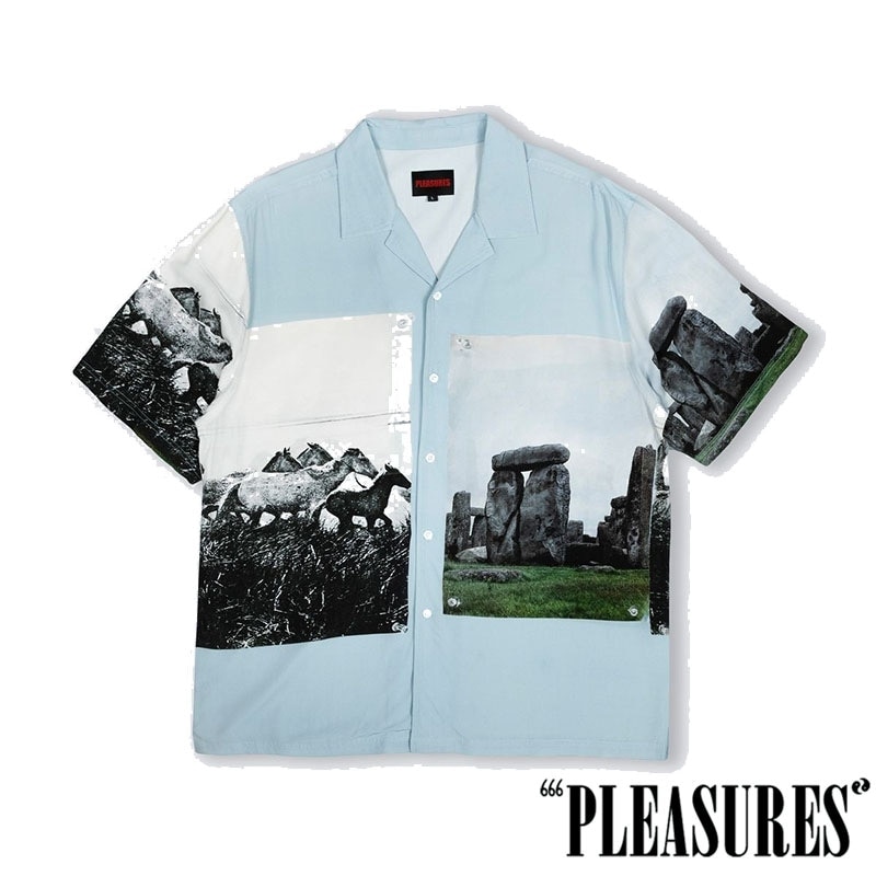 【PLEASURES/プレジャーズ】STONE HORSE BUTTON DOWN 半袖シャツ / POWDER BLUE