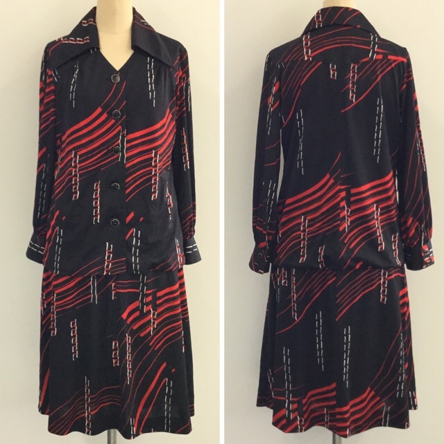 昭和レトロ モダン 長袖シャツスーツ レディース M-L/黒x白x赤 総柄 レトロ柄 ツーピース ポリシャツ ジャケット フレアス...