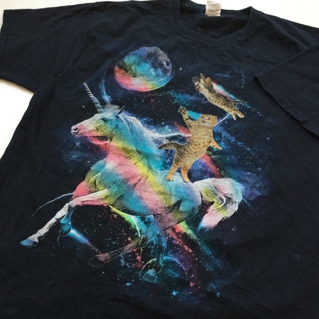 アメリカ古着 ユニコーン スペースキャット 送料無料 半袖Tシャツ メンズ L/黒・ブラック ネコ 宇宙 USA アメカジ ポップ...