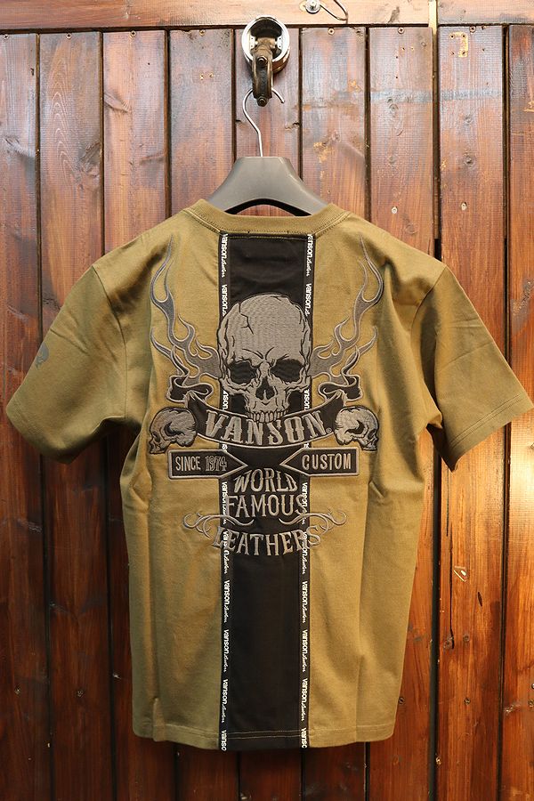 VANSON バンソン NVST-2306 天竺半袖Tee 刺繍スカル切替Tシャツ カーキ