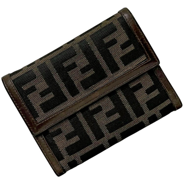 フェンディ 三つ折り 財布 カーキ ブラウン ズッカ 2270 30729 099 コンパクト キャンバス レザー 中古 FEND...