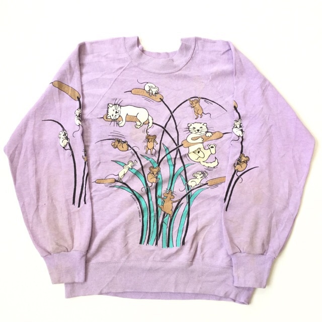 BW オールドスウェット アメリカ直輸入 猫プリントスウェット トレーナー 送料無料 S/紫・パープル ネズミ ラグラン 4本針 ...