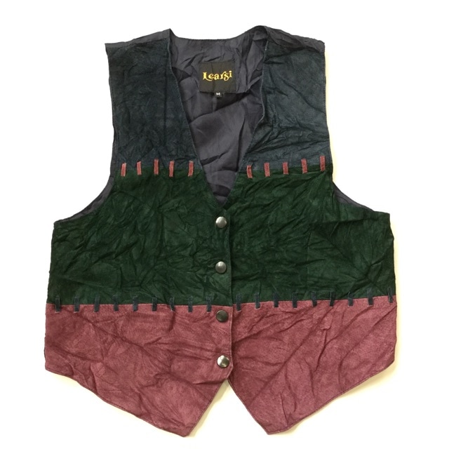 Learsi アメリカ直輸入 レザーベスト スーツベスト 送料無料 レディースM/紺x緑x小豆 パッチワーク スエード カジュアル...