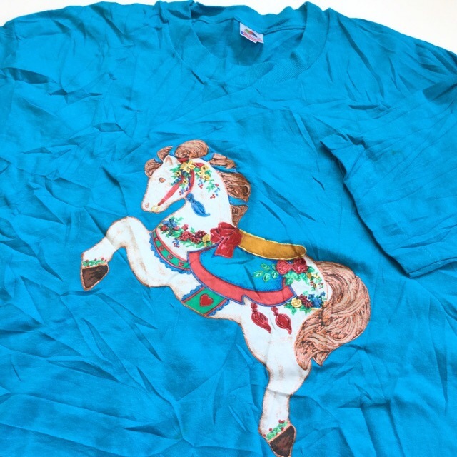 メリーゴーランド 半袖Tシャツ 送料無料 木馬 XL/水色 MADE IN USA ホース キャラ アメカジ アメリカ直輸入 古着...