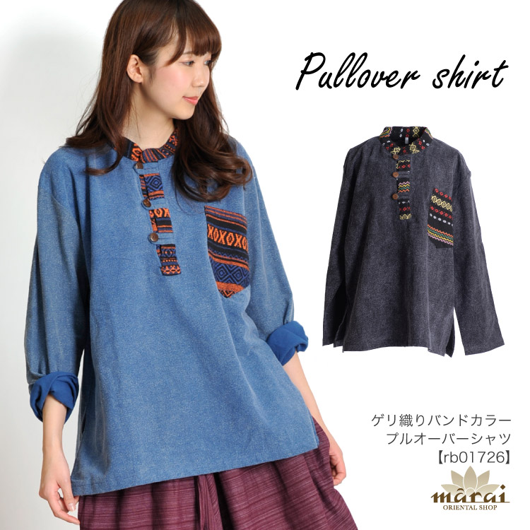 気張らないメンズライク。ゲリ織りバンドカラープルオーバーシャツ