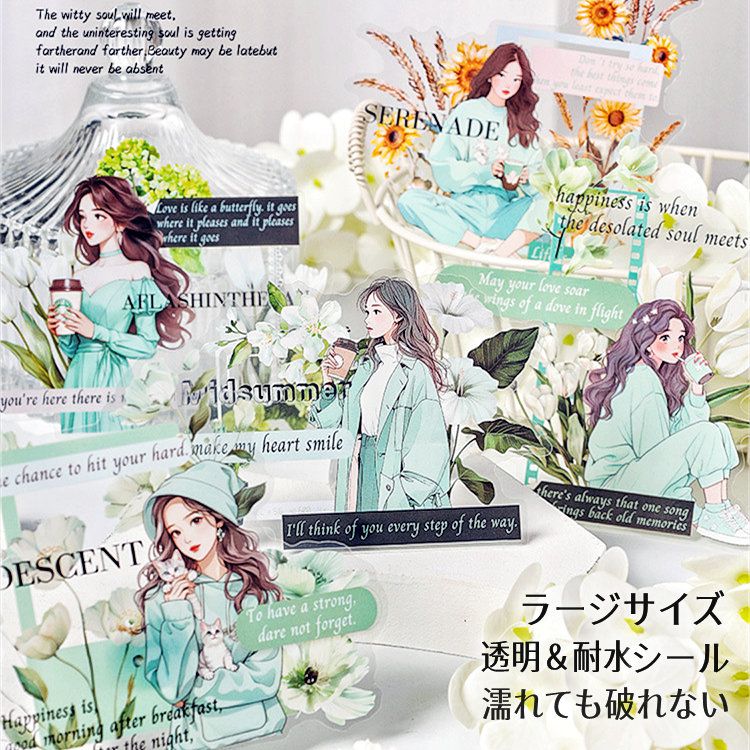 即日出荷 人物シール 大きめ 女の子 少女 英語 フレーム 枠 花柄 コーヒー シール PETシール クリアシール ラージサイズ ...