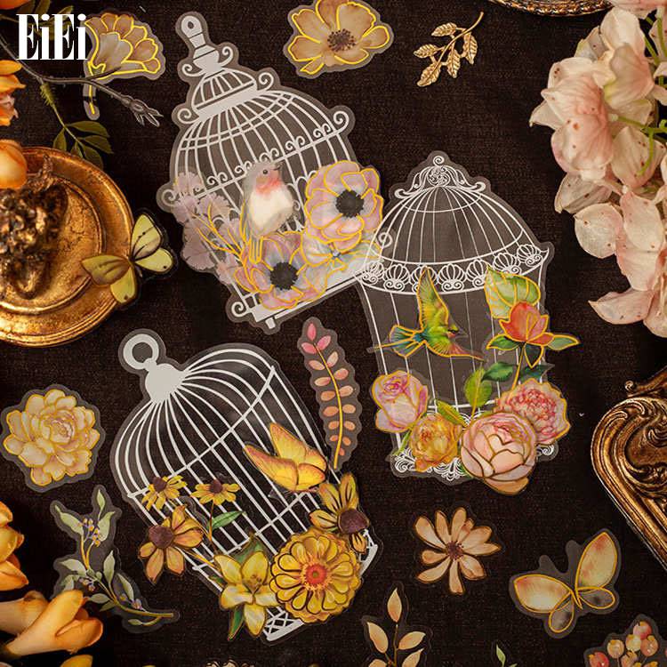 即日出荷 金箔 透明シール 鳥かご シール 海外シール フレークシール コラージュ素材 鳥籠 小鳥 シール 花 フラワー 蝶 薔薇...