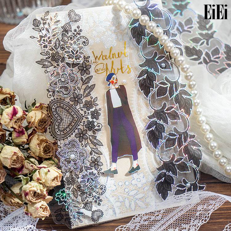 即日出荷 レース調 オーロラ ステッカー 銀箔押し 黒 白 大きめ 透ける オーロララメ シール 半透明 コラージュ 素材 ジャン...
