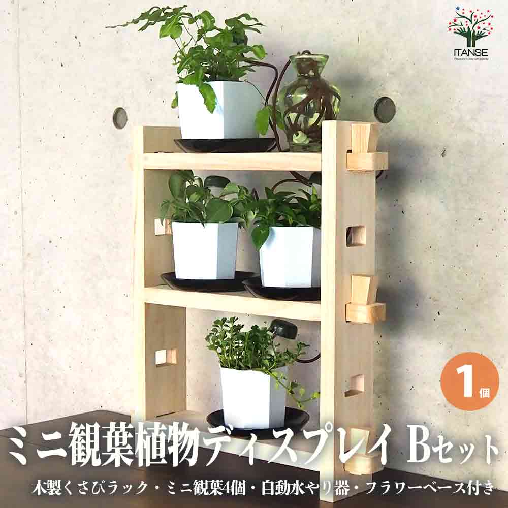 ミニ観葉植物ディスプレイ&生育棚 自動水やり器付き・木製くさびラックBセット(ミニ観葉4個付き)【資材 /1個売り】