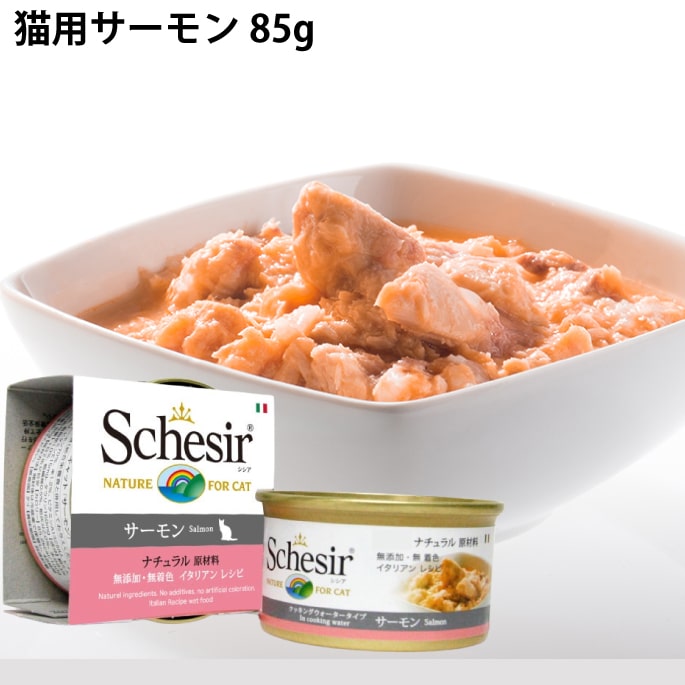 DHA豊富なサーモン主体の猫缶|Schesir(シシア)/キャット サーモン缶 85g クッキングウォータータイプ