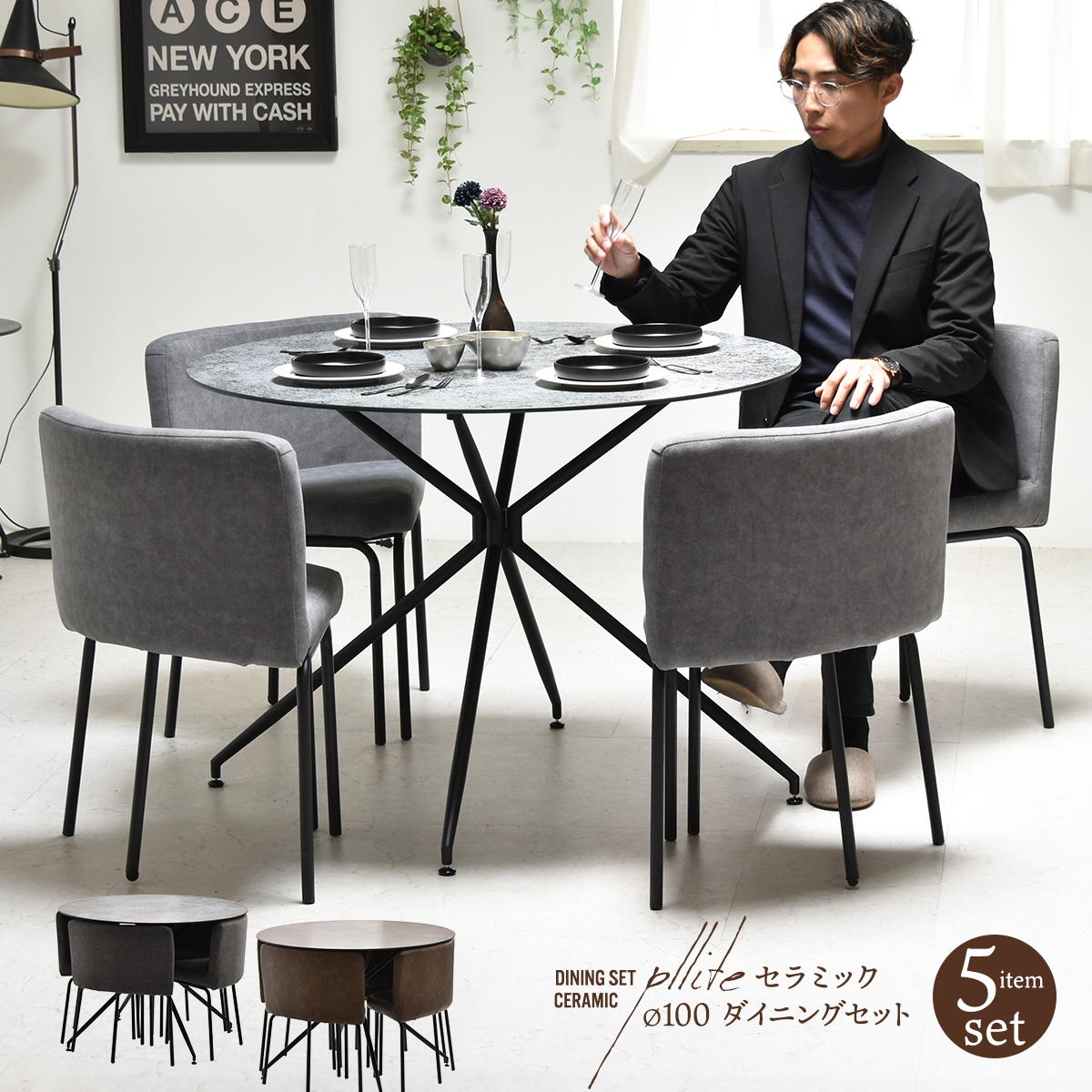ダイニングテーブル幅100&チェア 5点セット セラミックテーブル チェア4脚セット 4人用 省スペースダイニングセット 丸テー...