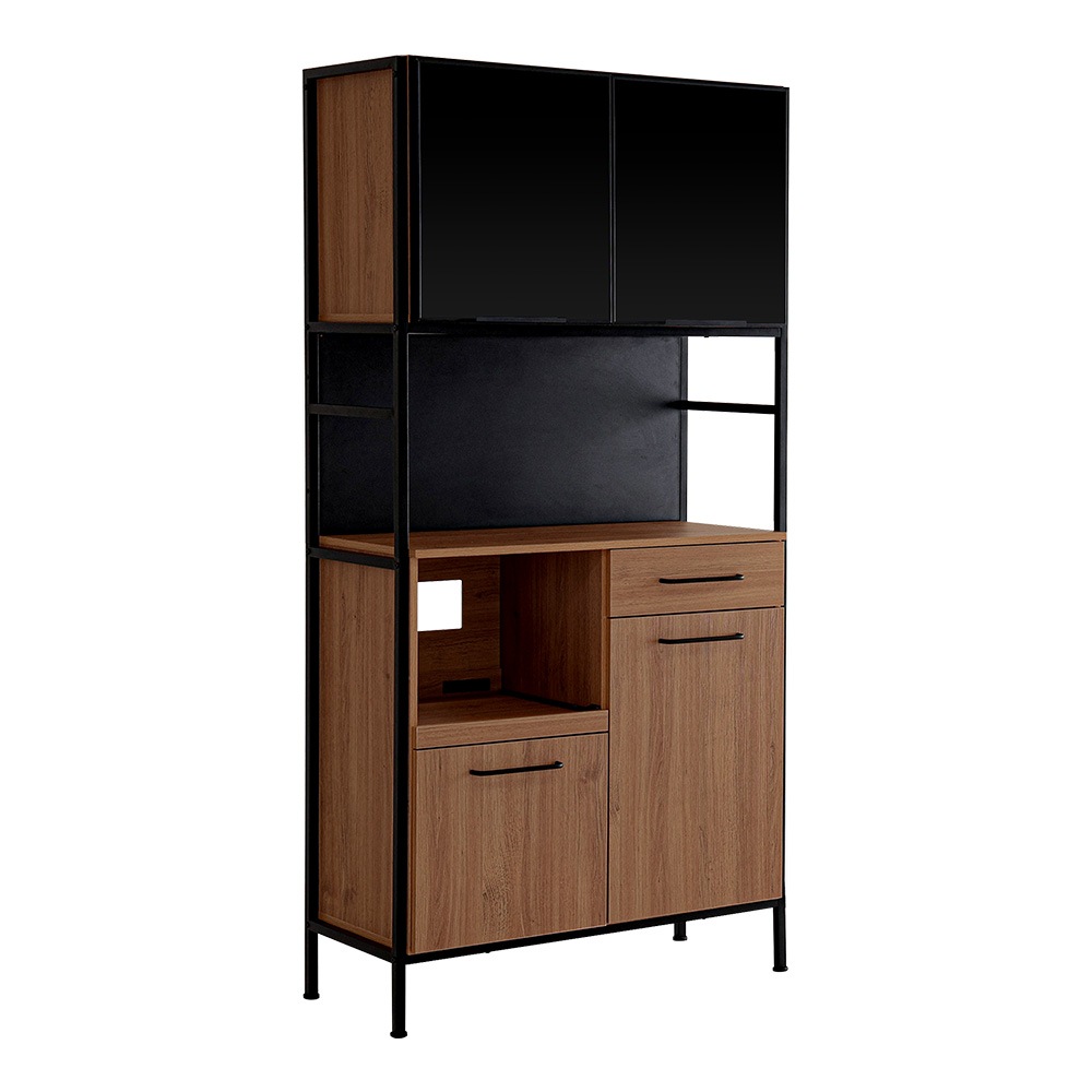 ヴィンテージ調マグネットワイド食器棚 ブラックガラス【GREACK-グリック-】MGK-18135-WAL ウォールナット