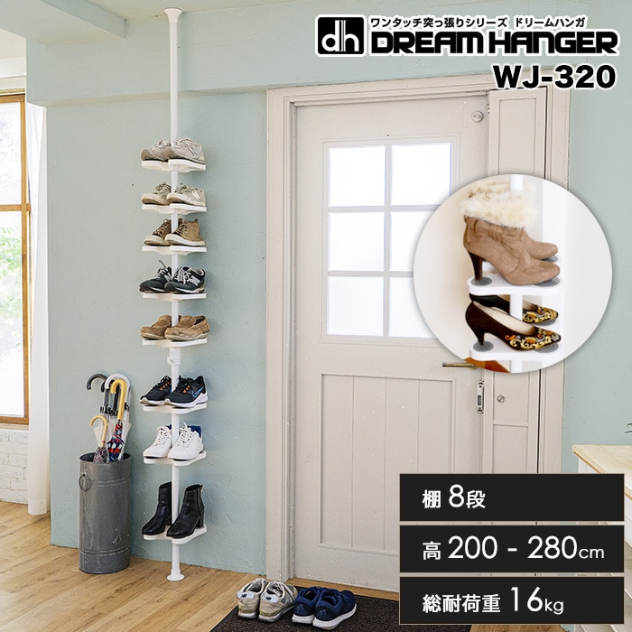 【簡単】 ワンタッチ式突っ張りポールハンガー シューズラック 8段 棚付き 高さ200-280cm 総耐荷重16kg 靴置き ドリ...