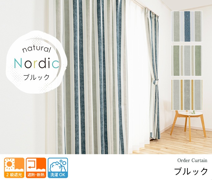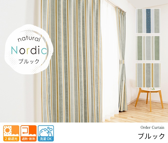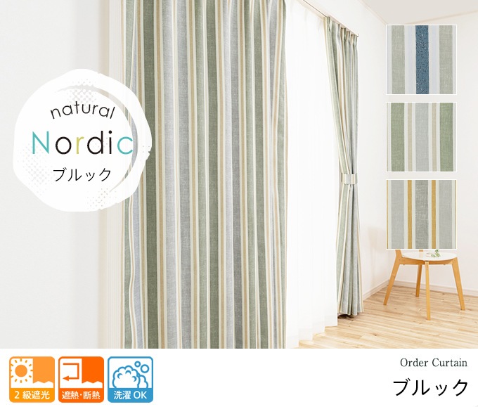 ナチュラル ノルディック ブルック(グリーン) オーダーカーテン/2級遮光 遮熱・断熱 洗濯OK 日本製