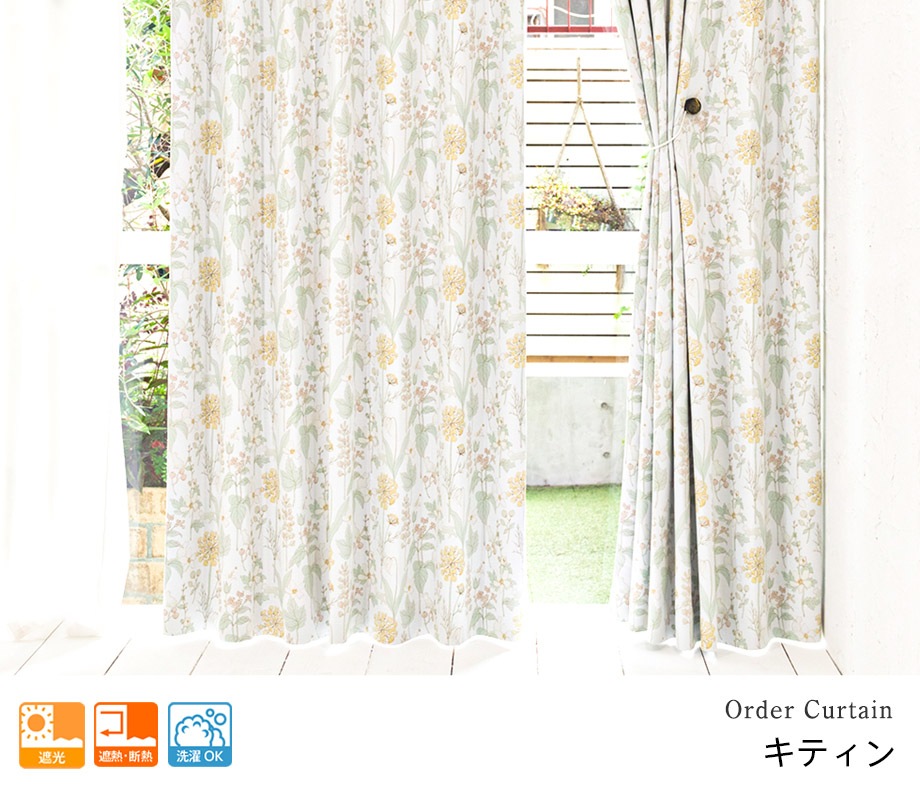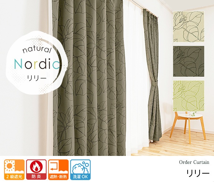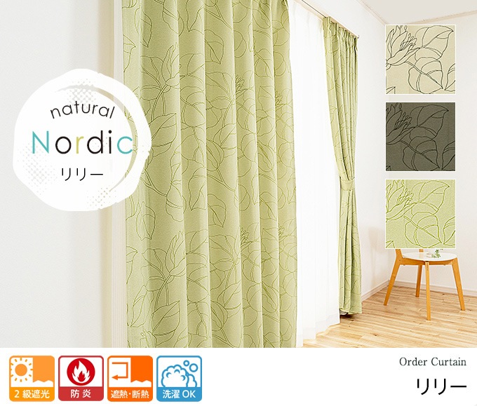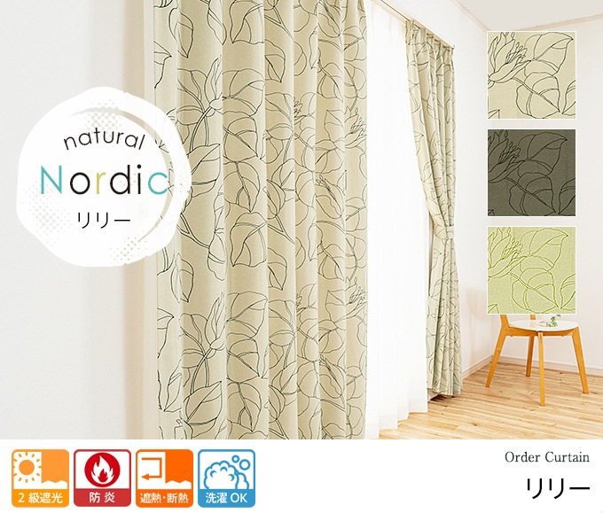 ナチュラル ノルディック 防炎 リリー(グリーン) オーダーカーテン/2級遮光 遮熱・断熱 防炎 洗濯OK 日本製