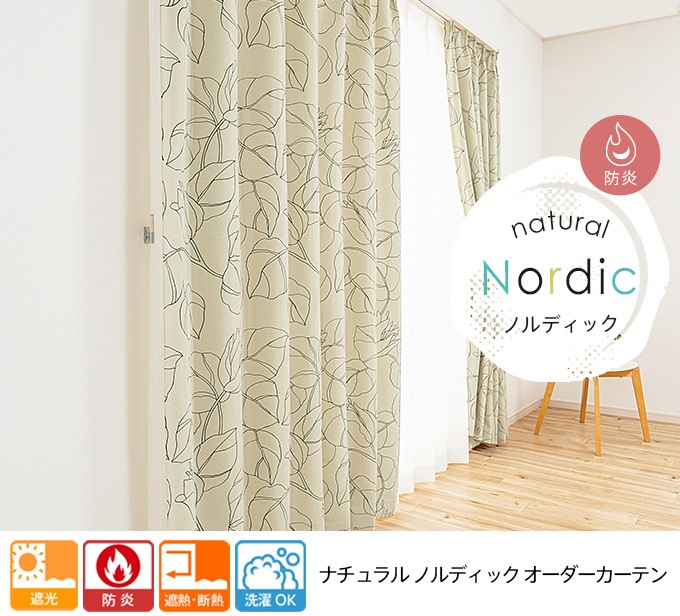 ナチュラル ノルディック 防炎 リリー(アイボリー) オーダーカーテン/2級遮光 遮熱・断熱 防炎 洗濯OK 日本製