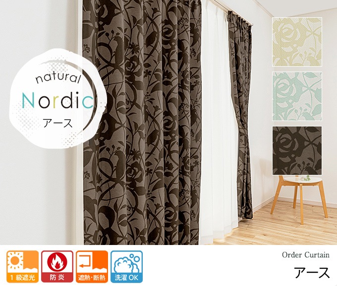 ナチュラル ノルディック 防炎 リリー(ブラウン) オーダーカーテン/2級遮光 遮熱・断熱 防炎 洗濯OK 日本製