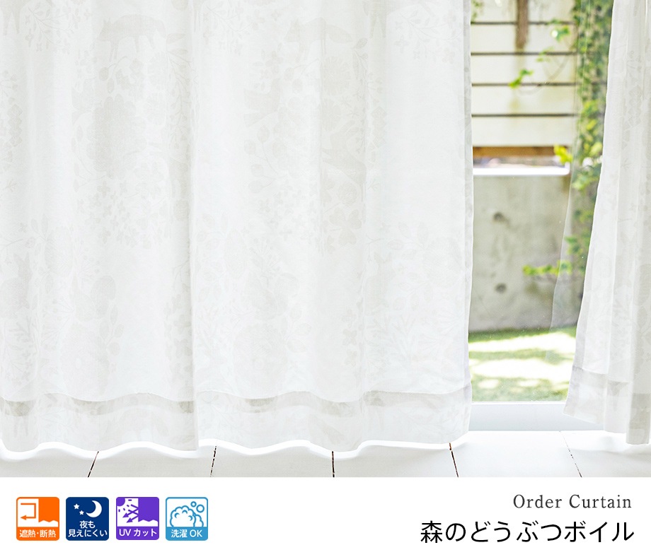 花のサークルに囲まれた動物たちが可愛い遮像レースカーテン「森のどうぶつボイル」ホワイト