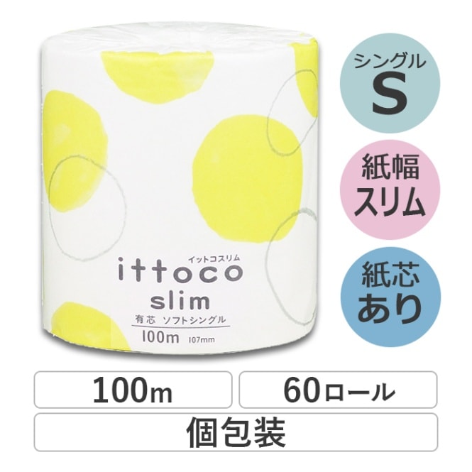 業務用 トイレットペーパー シングル 100m 60ロール イットコ 有芯 スリム幅(107mm) ミシン目なし 無香料 1010...