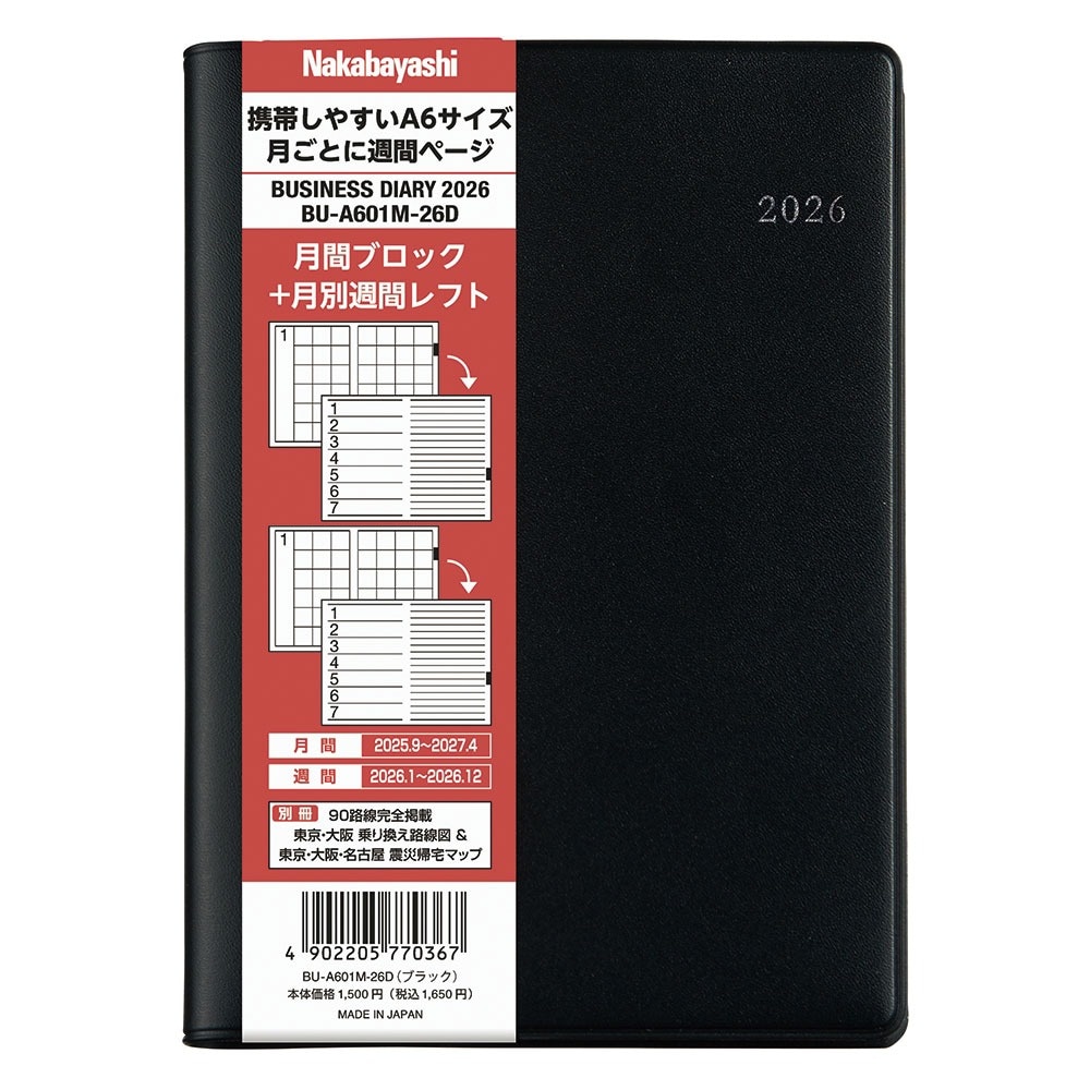【未使用】ナカバヤシ 手帳 2026 ビジネスダイアリー 月別レフト A6 ブラックBU-A601M-26D●メール便●代引き不可