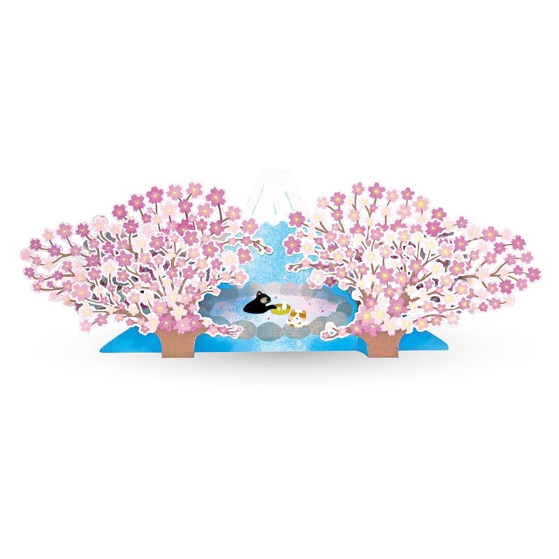 桜ポップアップカード 猫と温泉