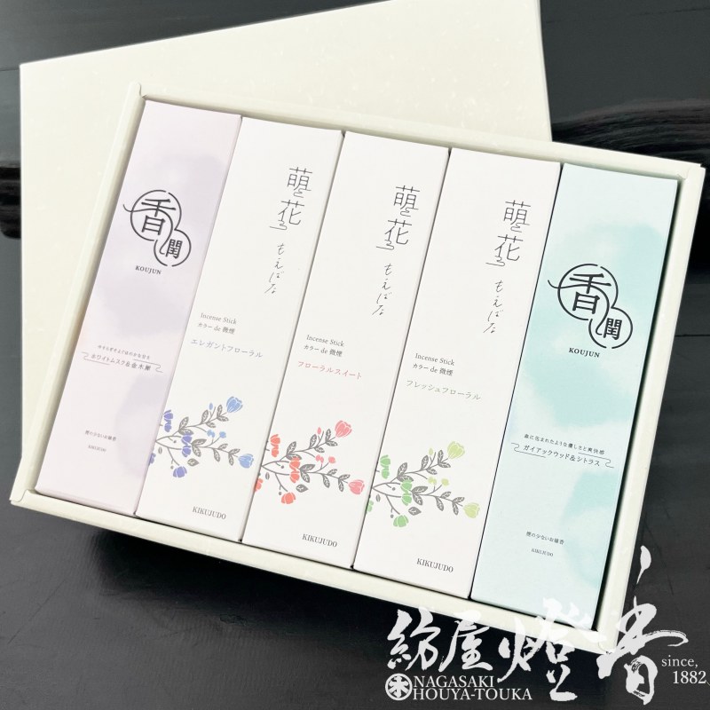 ご贈答/進物『自然に包まれた心地よさ【香潤&萌花-KOUJUN&MOEBANA-/5種アソート】短寸紙箱詰合せ[少煙]』菊寿堂