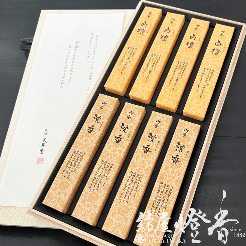 ご贈答/進物『香木の薫りを贈る【白檀・沈香~二種詰合せ~】短寸8箱木箱入[有煙]』天年堂