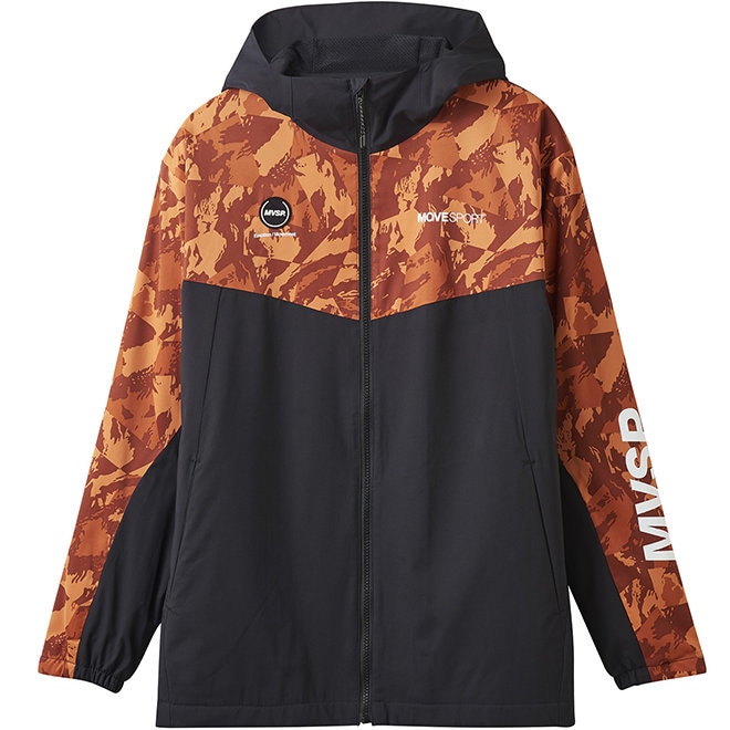 ムーブスポーツ 撥水ジャケット フード付き HEATNAVI 総柄グラフィック スリーブロゴ フルジップフーディー メンズ オレン...