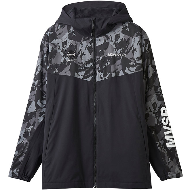 ムーブスポーツ 撥水ジャケット フード付き HEATNAVI 総柄グラフィック スリーブロゴ フルジップフーディー メンズ ブラッ...
