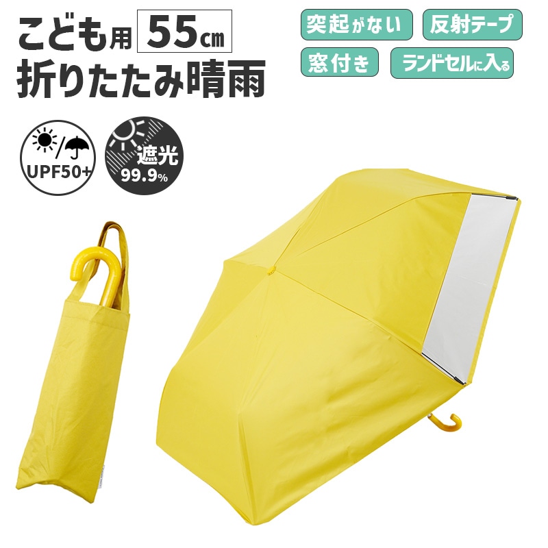 [54784] キッズ 折りたたみ傘 LINEDROPS 晴雨 55cm イエロー 黄色 透明窓 突起のない露先 反射テープ UV...