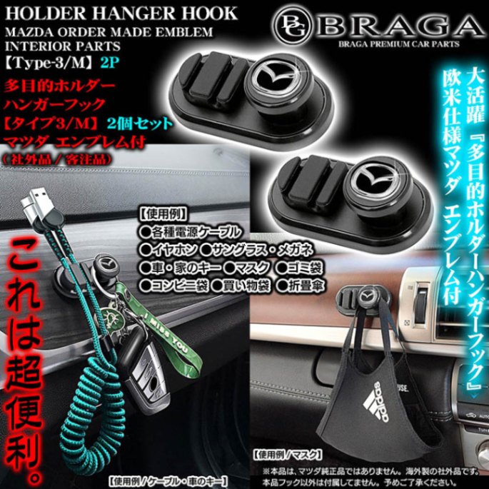 MPV/デミオ/キャロル/多目的ホルダーハンガーフック/マツダ マークエンブレム付/客注品/2個セット【タイプ3/M】ケーブル マ...