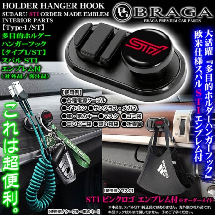 レヴォーグ/WRX/S4/BRZ/VX/多目的ホルダーハンガーフック/スバルSTIエンブレム付/客注品【タイプ1/ST】ケーブル ...