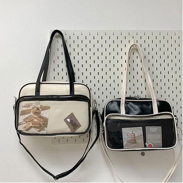 レディース ボストンバッグ 2WAY 肩掛け 手提げ ショルダーバッグ スクールバッグ クリアポケット付き リベット付き 長さ調節...