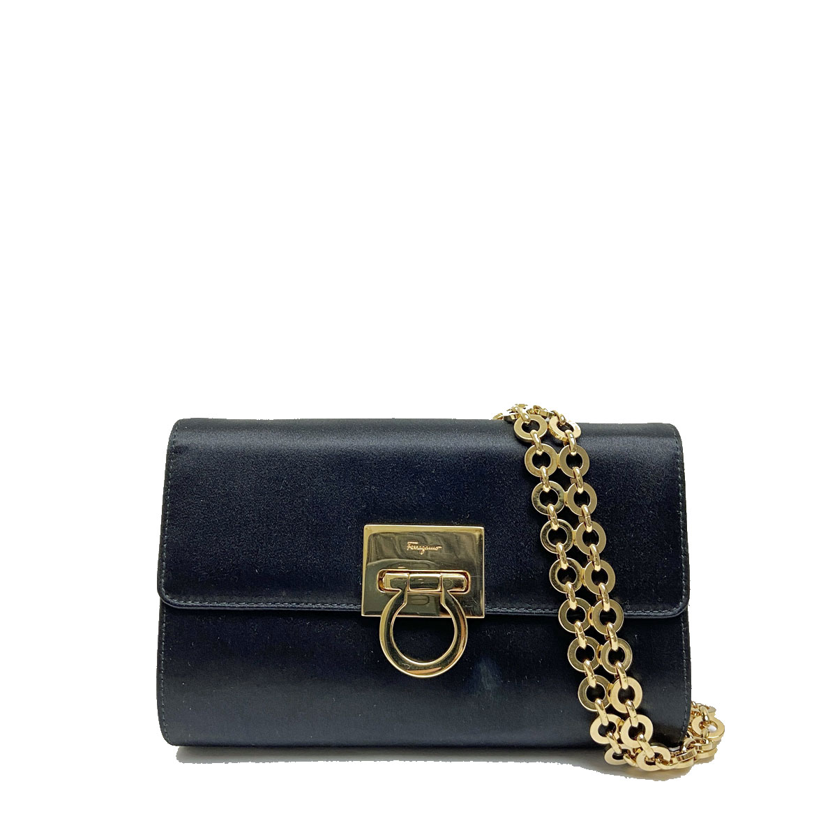 ■サルヴァトーレフェラガモ■ 斜め掛け チェーンショルダーミニバッグ サテン ブラック 【Salvatore Ferragamo】