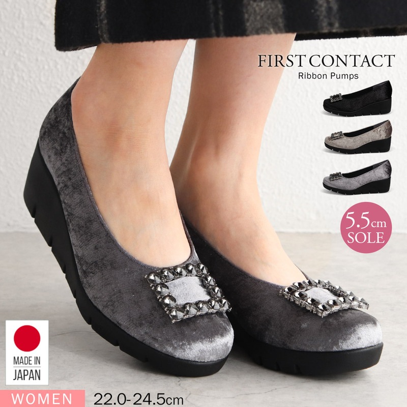 パンプス レディース ウェッジソール 歩きやすい コンフォート ベロア 日本製 ファーストコンタクト 黒 ブラック グレー ベージ...
