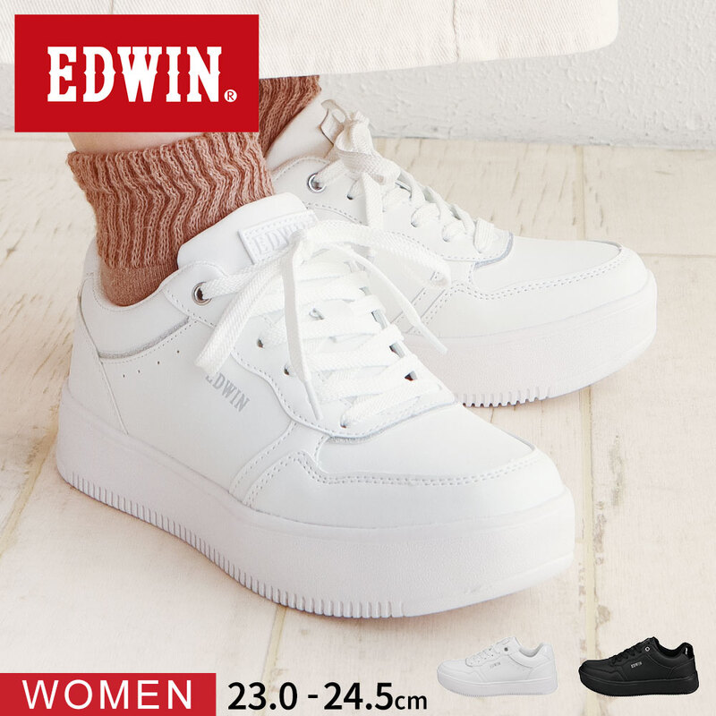EDWIN エドウィン スニーカー レディース 黒 ローカット シンプル カジュアル 厚底 紐靴 シューズ 白 ホワイト ブラック...