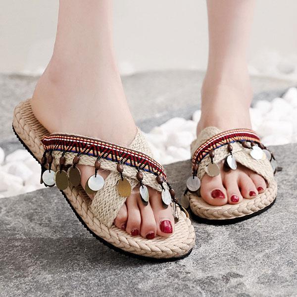 レディース ビーチサンダル エスニック風 EVA ラバー ゴム 草履 サンダル トングサンダル スリッパ フラット 鼻緒 麻縄 リ...