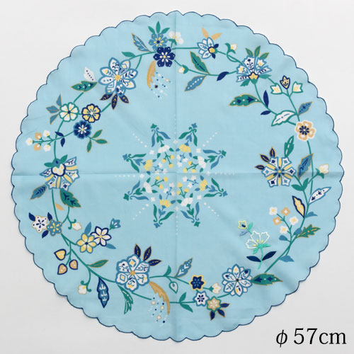 刺繍大判まるハンカチ 花和更紗 ブルー (1840-A) φ57cm綿ハンカチ Cotton handkerchief