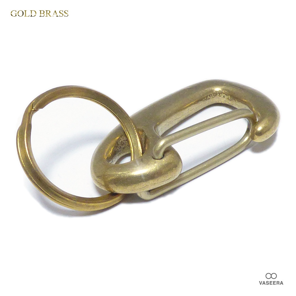 ゴールドブラス(真鍮) 58mm変形D型 カラビナパーツ 30mmダブルリング(二重カン付き)キーホルダー /キーリング