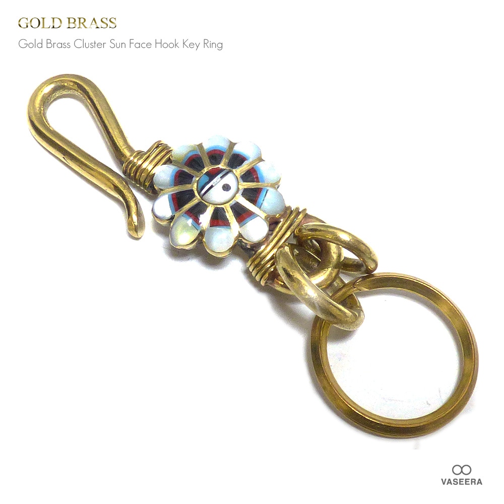 ゴールドブラス(真鍮) ネイティブアメリカン サン・フェイス 天然石クラスター仕上げ 30mm二重カン付き ベルトフック キーホル...