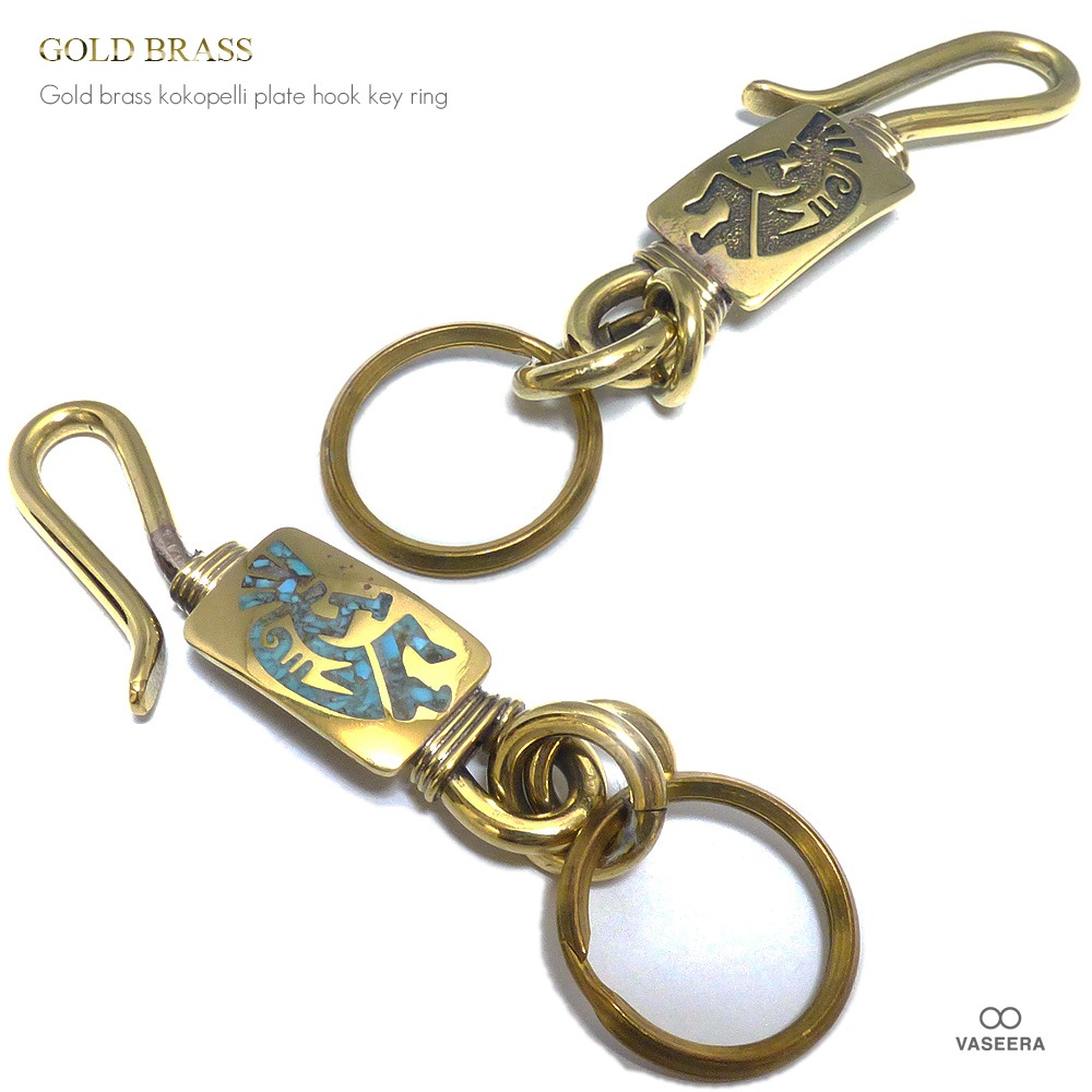 ゴールドブラス(真鍮) ネイティブ系 精霊ココペリ スクエア・プレート 30mm二重カン付き ベルトフック キーホルダー 【キーリ...
