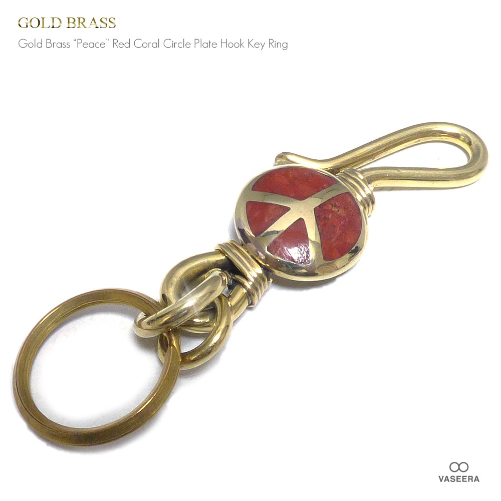 ゴールドブラス(真鍮) ピースマーク レッドコーラル(赤珊瑚)インレイ仕上げ 30mm二重カン付き ベルトフック キーホルダー 【...