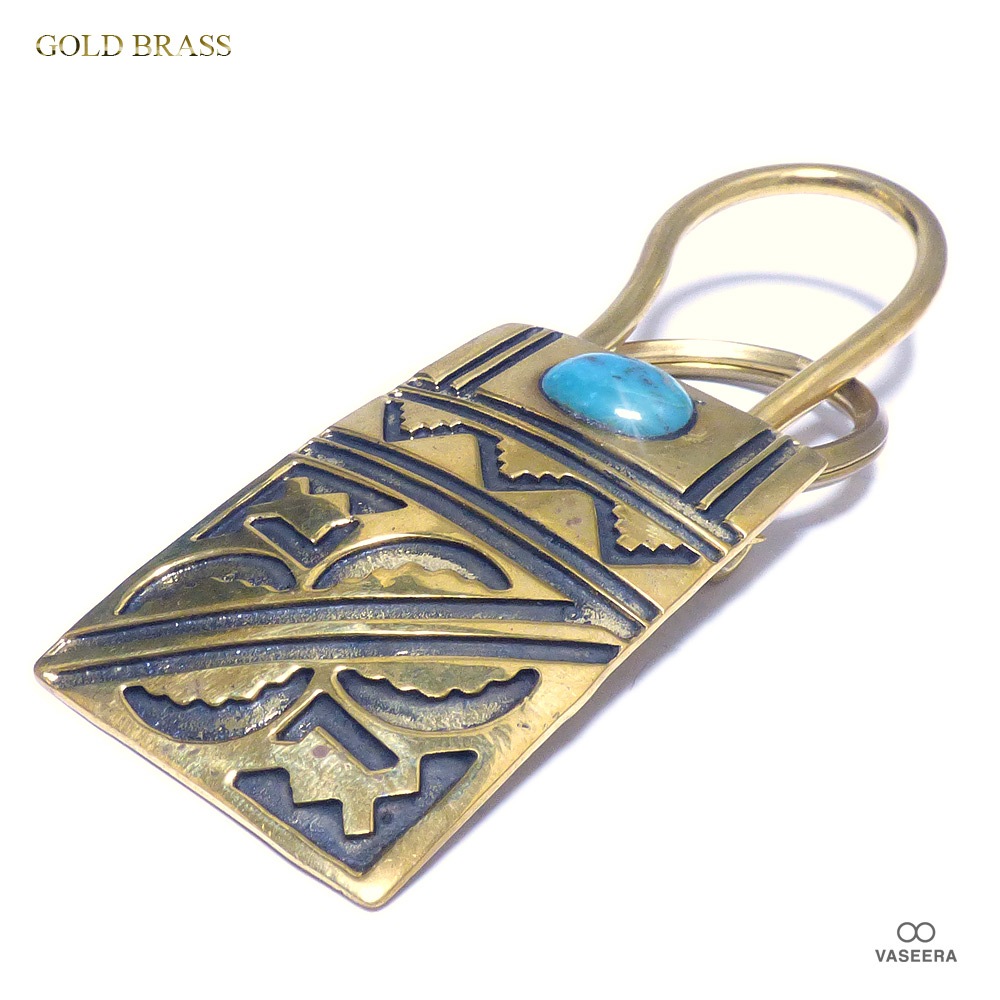 ゴールドブラス(真鍮) ネイティブアメリカン ターコイズ埋込みスクエアプレート 30mm二重カン付き フックロック式 キーホルダー...
